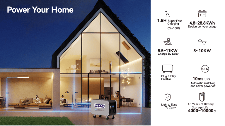 The DEXIN A Series is a mobile home energy storage system that combines battery, inverter, BMS and charging into one compact, wheeled unit. With 5–10 kW of output power and 4.8–28.6 kWh of storage capacity, it delivers silent, clean and reliable energy for homes, RVs, light industry and outdoor work.